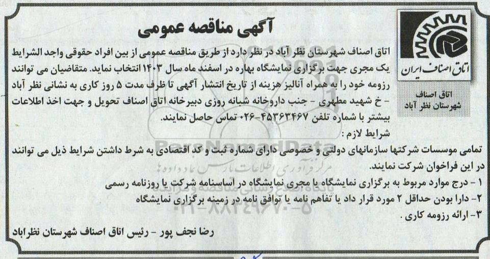 اتاق اصناف شهرستان نظر آباد در نظر دارد از طریق مناقصه عمومی از بین افراد حقوقی واجد الشرایط یک مجری جهت برگزاری نمایشگاه بهاره در اسفند ماه سال 1403 انتخاب نماید. متقاضیان می توانند رزومه خود را به همراه آنالیز هزینه از تاریخ انتشار آگهی تا ظرف مدت 5 روز کاری به نشانی نظر آباد خ شهید مطهری - جنب داروخانه شبانه روزی دبیرخانه اتاق اصناف تحویل و جهت اخذ اطلاعات بیشتر با شماره تلفن 45363467-026 تماس حاصل نمایند.