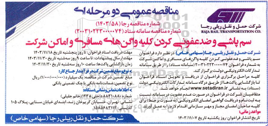 شرکت حمل و نقل ریلی رجا (سهامی خاص) در نظر دارد فراخوان سم پاشی و ضدعفونی کردن کلیه واگن های مسافری و اماکن شرکت به شماره فراخوان 2003102230000074 سامانه ستاد را از طریق سامانه تدارکات الکترونیکی دولت برگزار نماید. کلیه مراحل برگزاری فراخوان از دریافت و تحویل اسناد فراخوان تا بازگشایی پاکتها از طریق درگاه سامانه تدارکات الکترونیک دولت ستاد به ادرس سایت ستاد انجام خواهد شد. متقاضیان شرکت در فراخوان در صورت عدم عضویت در سامانه نسبت به ثبت نام و دریافت گواهی امضای الکترونیکی به صورت برخط برای کلیه صاحبان امضای مجاز و مهر سازمانی اقدام لازم را بعمل اورند