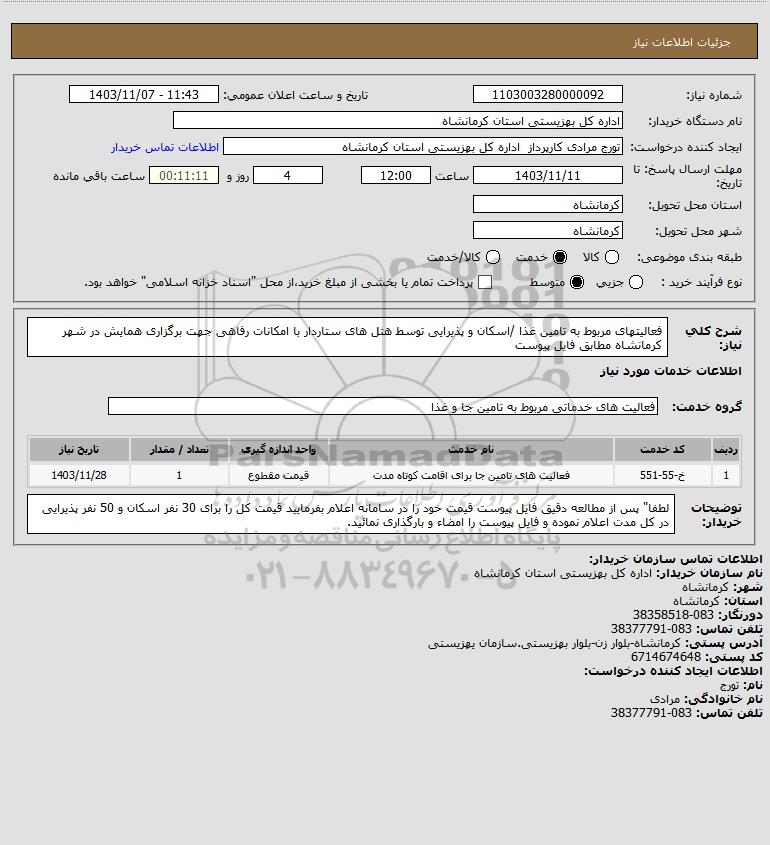 شرح کلی نیاز: فعالیتهای مربوط به تامین غذا /اسکان و پذیرایی توسط هتل های ستاردار با امکانات رفاهی جهت برگزاری همایش در شهر کرمانشاه مطابق فایل پیوست