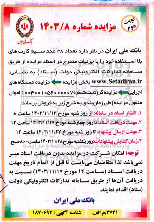 بانک ملی ایران در نظر دارد تعداد 38 عدد سیم کارت های بلا استفاده خود را با جزئیات مندرج در اسناد مزایده از طریق سامانه تدارکات الکترونیکی دولت (ستاد) به نشانی: ستاد ایران بخش مزایده - مزایده دستگاه های اجرایی - مزایده گر (تحت شماره 1003001056000007 اموال منقول مزایده) طی زمان بندی به شرح زیر به فروش برساند.