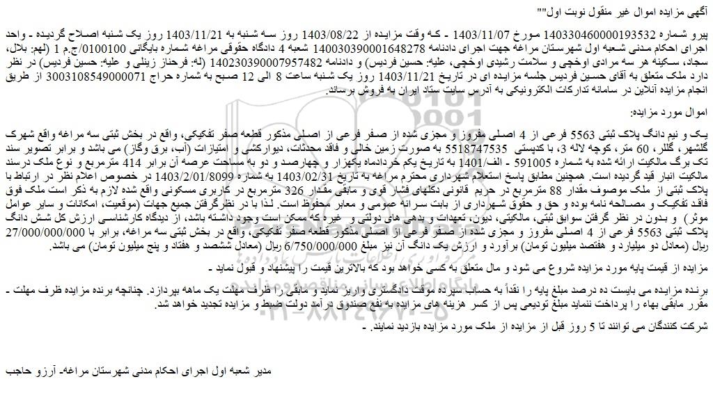 پیرو شماره 140330460000193532 مورخ 1403/11/07 - که وقت مزایده از 1403/08/22 روز سه شنبه به 1403/11/21 روز یک شنبه اصلاح گردیده - واحد اجرای احکام مدنی شعبه اول شهرستان مراغه جهت اجرای دادنامه 140030390001648278 شعبه 4 دادگاه حقوقی مراغه شماره بایگانی 0100100/ج.م 1 (لهم: بلال، سجاد، سکینه هر سه مرادی اوخچی و سلامت رشیدی اوخچی، علیه: حسین فردیس) و دادنامه 140230390007957482 (له: فرحناز زینلی و علیه: حسین فردیس) در نظر دارد ملک متعلق به آقای حسین فردیس جلسه مزایده ای در تاریخ 1403/11/21 روز یک شنبه ساعت 8 الی 12 صبح به شماره حراج 3003108549000071 از طریق انجام مزایده آنلاین در سامانه تدارکات الکترونیکی به آدرس سایت ستاد ایران به فروش برساند.