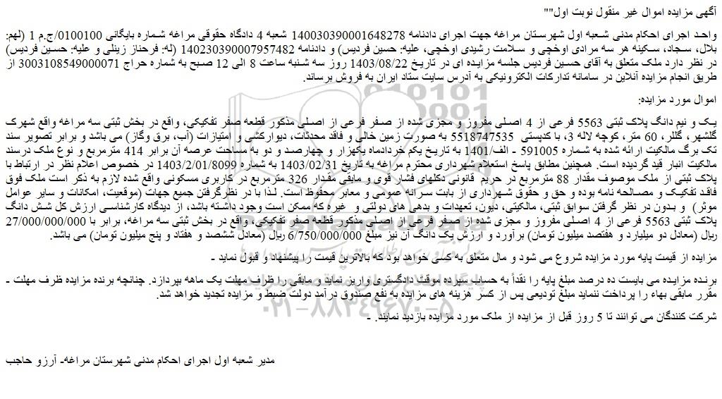 واحد اجرای احکام مدنی شعبه اول شهرستان مراغه جهت اجرای دادنامه 140030390001648278 شعبه 4 دادگاه حقوقی مراغه شماره بایگانی 0100100/ج.م 1 (لهم: بلال، سجاد، سکینه هر سه مرادی اوخچی و سلامت رشیدی اوخچی، علیه: حسین فردیس) و دادنامه 140230390007957482 (له: فرحناز زینلی و علیه: حسین فردیس) در نظر دارد ملک متعلق به آقای حسین فردیس جلسه مزایده ای در تاریخ 1403/08/22 روز سه شنبه ساعت 8 الی 12 صبح به شماره حراج 3003108549000071 از طریق انجام مزایده آنلاین در سامانه تدارکات الکترونیکی به آدرس سایت ستاد ایران به فروش برساند.