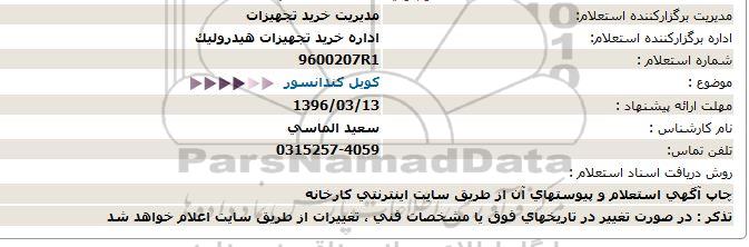 اداره برگزارکننده استعلام: اداره خرید تجهیزات هیدرولیک