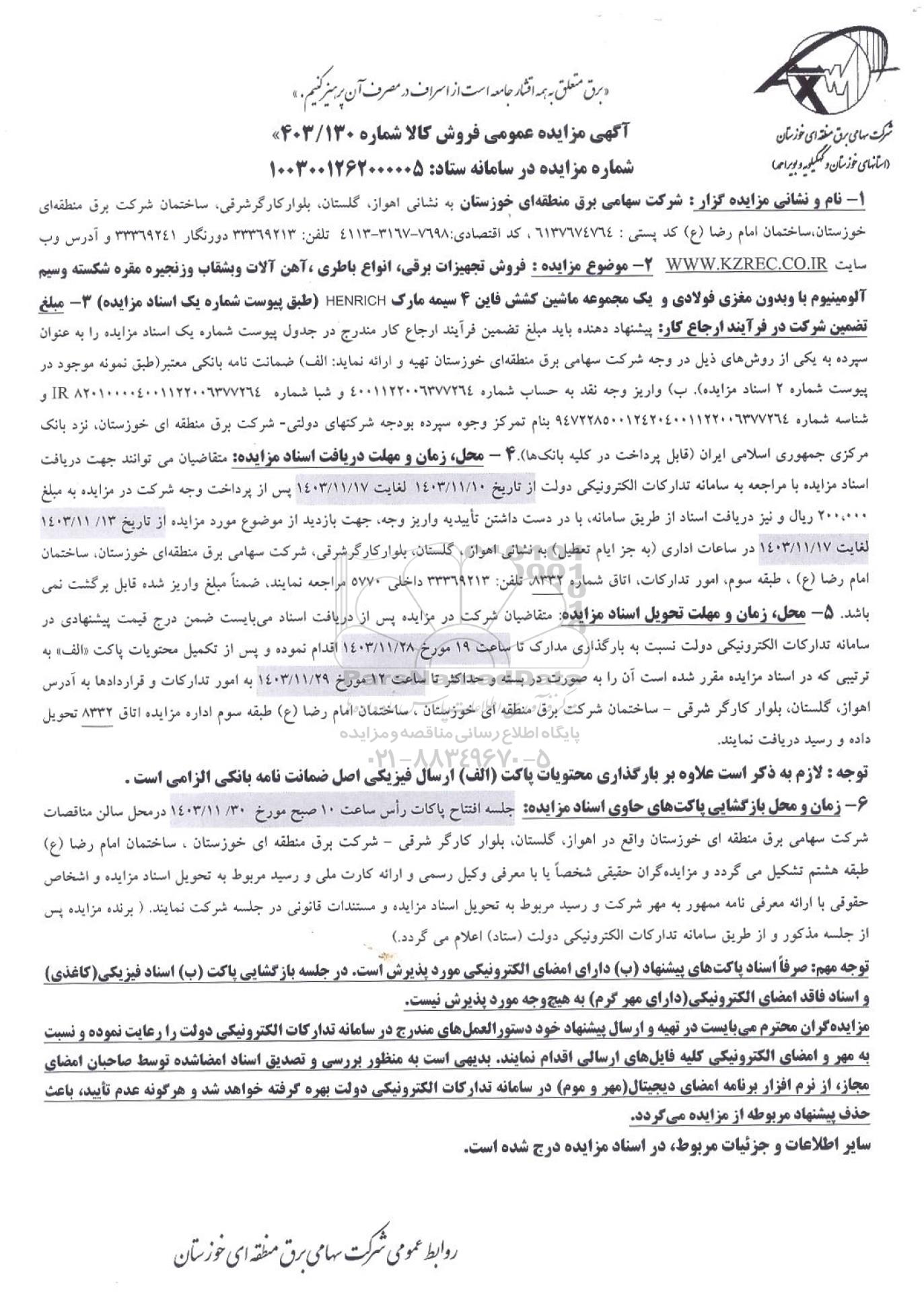 2-موضوع مزایده : فروش تجهیزات برقی، انواع باطری ، آهن آلات و بشقاب وزنجیره مقره شکسته وسیم آلومینیوم با و بدون مغزی فولادی و یک مجموعه ماشین کشش فاین 4 سیمه مارک HENRICH طبق پیوست شماره یک اسناد مزایده 3- مبلغ تضمین شرکت در فرآیند ارجاع کار پیشنهاد دهنده باید مبلغ تضمین فرآیند ارجاع کار مندرج در جدول پیوست شماره یک اسناد مزایده را به عنوان سپرده به یکی از روشهای ذیل در وجه شرکت سهامی برق منطقه ای خوزستان تهیه و ارائه نماید: الف) ضمانت نامه بانکی معتبر طبق نمونه موجود در پیوست شماره 2 اسناد مزایده (ب) واریز وجه نقد به حساب شماره ٤001122006377264 و شبا شماره 820100004001122009377264 IR و شناسه شماره 947228500124204001122006377264 بنام تمرکز وجوه سپرده بودجه شرکتهای دولتی شرکت برق منطقه ای خوزستان نزد بانک مرکزی جمهوری اسلامی ایران قابل پرداخت در کلیه بانک ها 4- محل زمان و مهلت دریافت اسناد مزایده متقاضیان می توانند جهت دریافت اسناد مزایده با مراجعه به سامانه تدارکات الکترونیکی دولت از تاریخ 1403.11.10 لغایت 1403.11.17 پس از پرداخت وجه شرکت در مزایده به مبلغ 200.000 ریال و نیز دریافت اسناد از طریق سامانه با در دست داشتن تأییدیه واریز وجه جهت بازدید از موضوع مورد مزایده از تاریخ 1403.11.13 لغایت 1403.11.17در ساعات اداری به جز ایام تعطیل به نشانی اهواز، گلستان بلوار کار گرشرقی شرکت سهامی برق منطقه ای خوزستان، ساختمان امام رضا (ع) ، طبقه سوم، امور تدارکات اتاق شماره 8332 تلفن: 33399213 داخلی 5770 مراجعه نمایند. ضمناً مبلغ واریز شده قابل برگشت نمی باشد. 5 محل زمان و مهلت تحویل اسناد مزایده متقاضیان شرکت در مزایده پس از دریافت اسناد می بایست ضمن درج قیمت پیشنهادی در سامانه تدارکات الکترونیکی دولت نسبت به بارگذاری مدارک تا ساعت 19 مورخ 1503.11.28 اقدام نموده و پس از تکمیل محتویات پاکت «الف» به ترتیبی که در اسناد مزایده مقرر شده است آن را به صورت در بسته و حداکثر تا ساعت 12 مورخ 1403.11.29 به امور تدارکات و قراردادها به آدرس اهواز گلستان بلوار کارگر شرقی - ساختمان شرکت برق منطقه ای خوزستان ، ساختمان امام رضا (ع) طبقه سوم اداره مزایده اتاق 8332 تحویل داده و رسید دریافت نمایند.