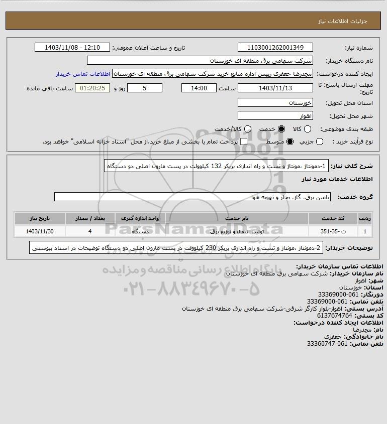 شرح کلی نیاز: 1-دمونتاژ ،مونتاژ و تست و راه اندازی بریکر 132 کیلوولت در پست مارون اصلی دو دستگاه