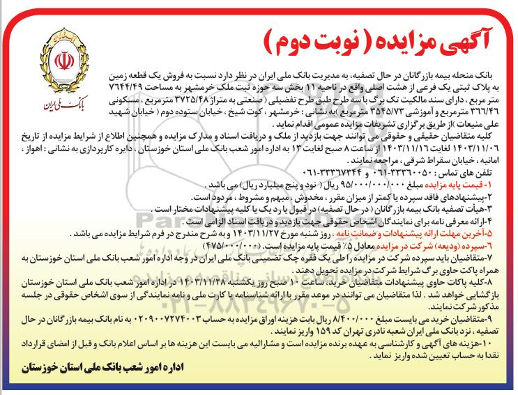 بانک منحله بیمه بازرگانان در حال تصفیه به مدیریت بانک ملی ایران در نظر دارد نسبت به فروش یک قطعه زمین به پلاک ثبتی یک فرعی از هشت اصلی واقع در ناحیه 11 بخش سه حوزه ثبت ملک خرمشهر به مساحت 7644.49 متر مربع ، دارای سند مالکیت تک برگ با سه طرح طبق طرح تفضیلی صنعتی به متراژ 3725.48 متر مربع مسکونی 366.46 متر مربع و آموزشی 3545.73 متر مربع) به نشانی: خرمشهر کوت شیخ ، خیابان ستوده دوم خیابان شهید علی منیعات از طریق برگزاری تشریفات مزایده عمومی اقدام نماید.