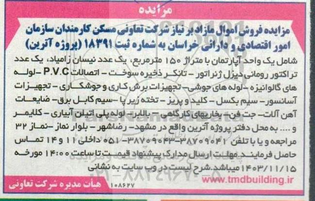 مزایده فروش اموال مازاد شرکت تعاونی مسکن کارمندان سازمان امور اقتصادی و دارائی خراسان به شماره ثبت (18391 پروژه آترین)