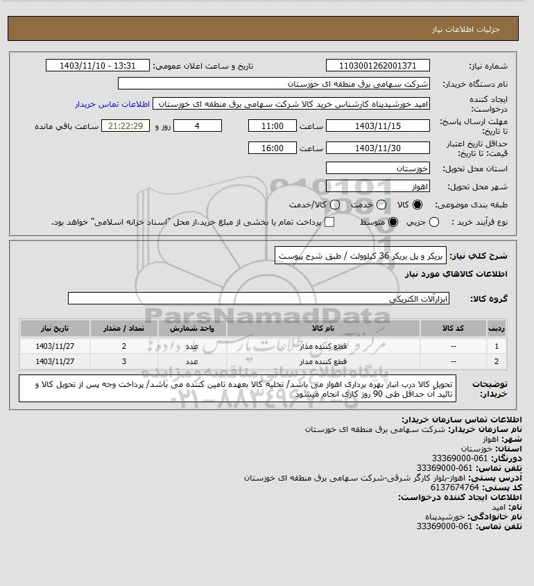 شرح کلی نیاز: بریکر و پل بریکر 36 کیلوولت / طبق شرح پیوست