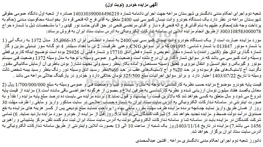 شعبه دوم اجرای احکام مدنی دادگستری شهرستان مراغه جهت اجرای دادنامه شماره 140330390004496219 صادره از شعبه اول دادگاه عمومی حقوقی شهرستان مراغه در نظر دارد یک دستگاه خودرو وانت نیسان کمپرسی تیپ 2400 متعلق به آقای فرج اله فتحی قره ناز بخواسته محکومیت مدنی (حکم به پرداخت وجه نقد)محکوم علیهم به نام آقای فرج اله فتحی قره ناز و آقای مرتضی فتحی در حق آقای حامد نور محمدی را با مشخصات ذیل با شماره حراج 3003108583000078 ازطریق انجام مزایده آنلاین در سامانه تدارکات الکترونیکی به آدرس سایت ستاد ایران به فروش برساند: