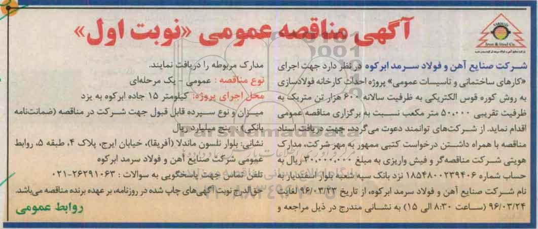 شرکت صنایع آهن و فولاد سرمد ابرکوه در نظر دارد جهت اجرای کارهای ساختمانی و تاسیسات عمومی پروژه احداث کارخانه فولادسازی به روش کوره قوس الکتریکی به ظرفیت سالانه 600هزار تن متریک به ظرفیت تقریبی 50.000 متر مکعب نسبت به برگزاری مناقصه عمومی اقدام نماید. از شرکت های توانمند دعوت می گردد،جهت دریافت اسناد مناقصه با همراه داشتن درخواست کتبی ممهور به مهر شرکت، مدارک هویتی شرکت مناقصه گر و فیش واریزی به مبلغ 30.000.000 رایل به حساب شماره 1854800239406 نزد بانک سپه شعبه بلوار اسفندیار به نام شرکت صنایع آهن و فولاد سرمد ابرکوه، از تاریخ 96.3.23 لغایت 96.3.24 (ساعت 8.30 الی 15 ) به نشانی مندرج در ذیل مراجعه و مدارک مربوطه را دریافت نمایند.