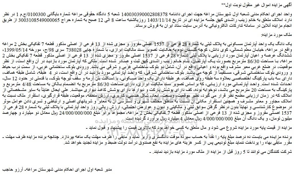 مزایده یک دانگ یک واحد آپارتمان مسکونی به پلاک ثبتی به شماره 28 فرعی از 1537 اصلی مفروز و مجزی شده از 13 فرعی از اصلی, مزایده یک دانگ یک واحد آپارتمان مسکونی به پلاک ثبتی به شماره 28 فرعی از 1537 اصلی مفروز و مجزی شده از 13 فرعی از اصلی