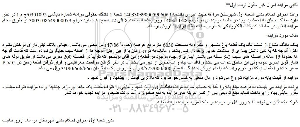 مزایده یک دانگ مشاع از ششدانگ یک قطعه باغ مشجر و مثمره به مساحت 6030 مترمربع عرصه (حدوداً 47/86) من محلی, مزایده یک دانگ مشاع از ششدانگ یک قطعه باغ مشجر و مثمره به مساحت 6030 مترمربع عرصه (حدوداً 47/86) من محلی