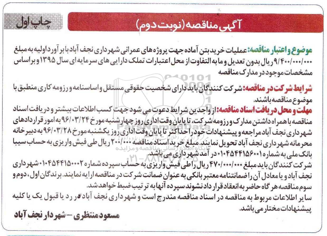 موضوع و اعتبار مناقصه: عملیات خرید بتن آماده جهت پروژه های عمرانی شهرداری نجف آباد با برآورد اولیه به مبلغ 9.400.000.000 ریال بدون تعدیل و مابه التفاوت از محل اعتبارات تملک دارایی های سرمایه ای سال 95 و براساس مشخصات موجود در مدارک مناقصه