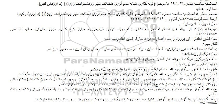 اصلاحیه مناقصه شماره 63-1-96 با موضوع لوله گذاری شبکه جمع آوری فاضلاب شهر ورنامخواست زون(1) (با ارزیابی کیفی)