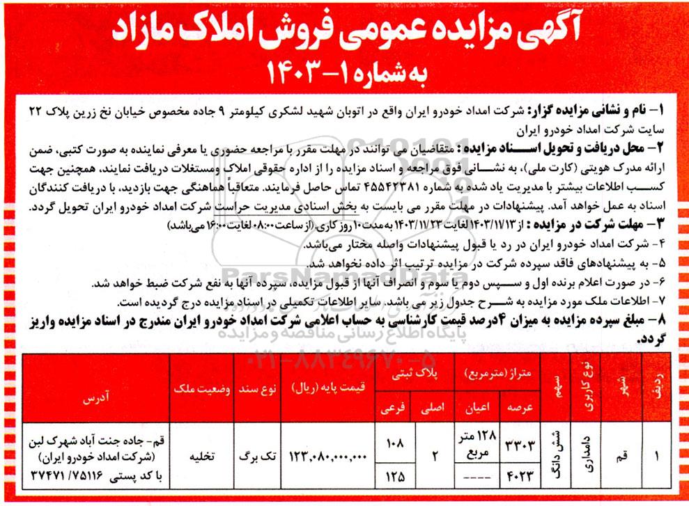 آگهی مزایده فروش املاک مازاد به شماره 1 - 1403