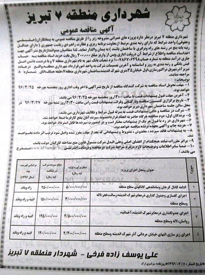 شهرداری منطقه 7 تبریز در نظر دارد پروژه های عمرانی مشروحه زیر را از طریق مناقصه عمومی به پیمانکاران حقیقی و حقوقی واجد شرایط که دارای رتبه بندی مرتبط از معاونت برنامه ریزی و نظارت راهبردی ریاست جمهوری دارای حداقل رتبه پایه پنج در رشته های راه و ترابری یا ساختمان باشند به پیمان واگذار نماید. لذا متقاضیان می توانند از تاریخ نشر آگهی جهت اخذ اسناد مناقصه و اطلاع از شرایط آن در وقت اداری و پس از واریز مبلغ 300.000 ریال بابت خرید اسناد مناقصه به حساب جاری درآمد منطقه به شماره حساب 100786706498 نزد شعبات بانک شهر به نام شهرداری منطقه 7 و با در دست داشتن اصل فیش بانکی و رتبه بندی به روز و اساسنامه و آ[رین تصمیمات شرکت به واحد امور قرارداد شهرداری منطقه واقع در جاده تبریز آذرشهر پل تراکتورسازی ، اول خیابان 35 متری شهرک اندیشه ، ساختمان شهرداری منطقه 7 ، طبقه همکف اتاق شماره 8 مراجعه نمایند.