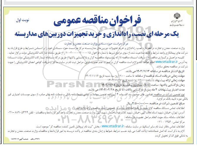 وزارت صنعت، معدن و تجارت در نظر دارد نصب، راه اندازی و خرید تجهیزات دوربین های مداربسته مرکز حراست حوزه ستادی خود را بر اساس شرایط و طرح قرارداد به شرکتهای پیمانکاری واجد شرایط و تایید صلاحیت شده از سوی مراجع ذیربط با شماره فراخوان 2003000003000015 را از طریق سامانه تدارکات الکترونیکی دولت برگزار نماید.