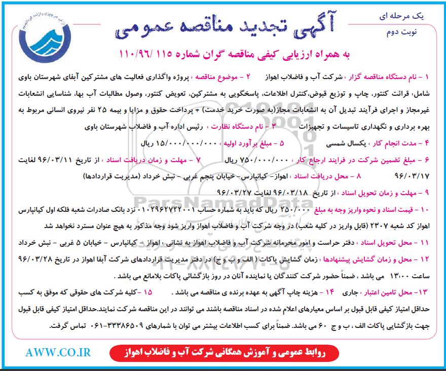 2- موضوع مناقصه: واگذاری فعالیتهای مشترکین آبفای شهرستان باوی شامل: قرائت کنتور ، چاپ و توزیع قبوض ، کنترل اطلاعات ؛ پاسخگویی به مشترکین ، تعویض کنتور ، وصول مطالبات آب بها ، شناسایی انشعابات غیر مجاز و اجرای فرایند تبدیل آن به انشعابات مجاز (به صورت خرید خدمت) + پرداخت حقوق و مزایا و بیمه 25 نفر نیروی انسانی مربوط به بهره برداری و نگهداری تاسیسات و تجهیزات