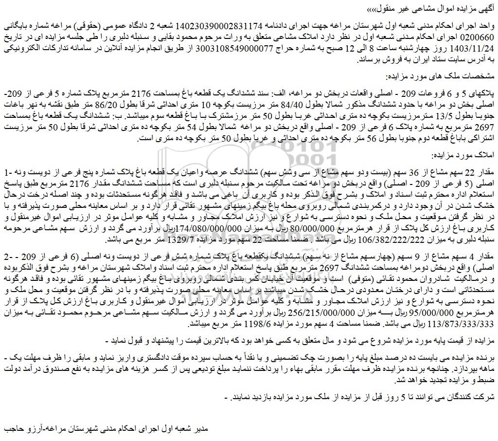 1- مقدار 22 سهم مشاع از 36 سهم (بیست ودو سهم مشاع از سی وشش سهم) ششدانگ عرصه واعیان یک قطعه باغ پلاک شماره پنج فرعی از دویست ونه اصلی (5 فرعی از 209 - اصلی) واقع دربخش دو مراغه تحت مالکیت مرحوم سنبله دلبری است که مساحت ششدانگ مقدار 2176 مترمربع طبق پاسخ استعلام اداره محترم ثبت اسناد و املاک و بشرح فوق الذکر بوده و کاربری آن  باغی می باشد و فاقد هرگونه مستحدثات بوده و چند اصله درخت درحال خشک شدن در آن وجود دارد و درکمربندی شمالی روبروی محله باغ بیگم زمینهای مشهور تقائی قرار دارد و بر اساس معاینه محلی صورت پذیرفته و با در نظر گرفتن موقعیت و محل ملک و نحوه دسترسی به شوارع و نیز ارزش املاک مجاور و مشابه و کلیه عوامل موثر در ارزیابی اموال غیرمنقول و کاربری باغ ارزش کل پلاک از قرار هرمترمربع 80/000/000 ریال به میزان 174/080/000/000ریال برآورد می گردد و ارزش  سهم مشاعی مرحومه سنبله دلبری به میزان 106/382/222/222 ریال می باشد . ضمنا مساحت 22 سهم مورد مزایده 1329/7 متر مربع می باشد.