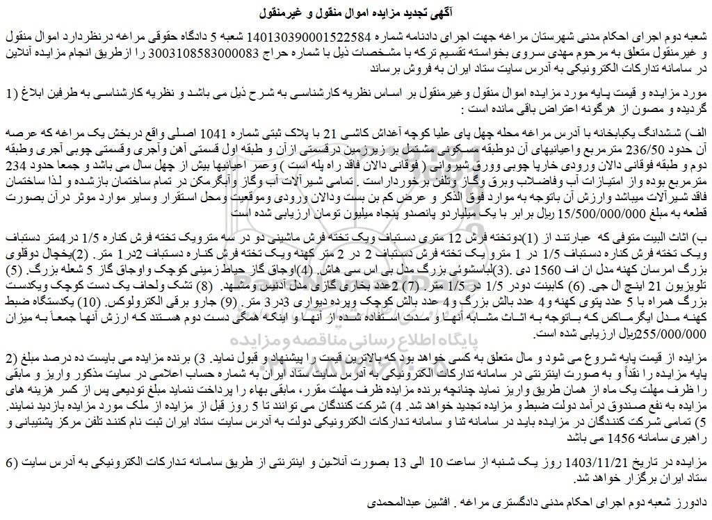 شعبه دوم اجرای احکام مدنی شهرستان مراغه جهت اجرای دادنامه شماره 140130390001522584 شعبه 5 دادگاه حقوقی مراغه درنظردارد اموال منقول و غیرمنقول متعلق به مرحوم مهدی سروی بخواسته تقسیم ترکه با مشخصات ذیل با شماره حراج 3003108583000083 را ازطریق انجام مزایده آنلاین در سامانه تدارکات الکترونیکی به آدرس سایت ستاد ایران به فروش برساند