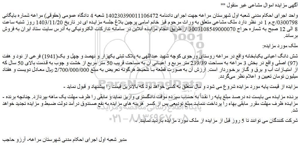 واحد اجرای احکام مدنی شعبه اول شهرستان مراغه جهت اجرای دادنامه 140230390011106472 شعبه 4 دادگاه عمومی (حقوقی) مراغه شماره بایگانی 0300798/ج.م 1 در نظر دارد ملک مشاعی متعلق به وراث مرحوم قیز خانم امامی پرچین بلاغ جلسه مزایده ای در تاریخ 1403/11/20 روز شنبه ساعت 8 الی 12 صبح به شماره حراج 3003108549000070 از طریق انجام مزایده آنلاین در سامانه تدارکات الکترونیکی به آدرس سایت ستاد ایران به فروش برساند.