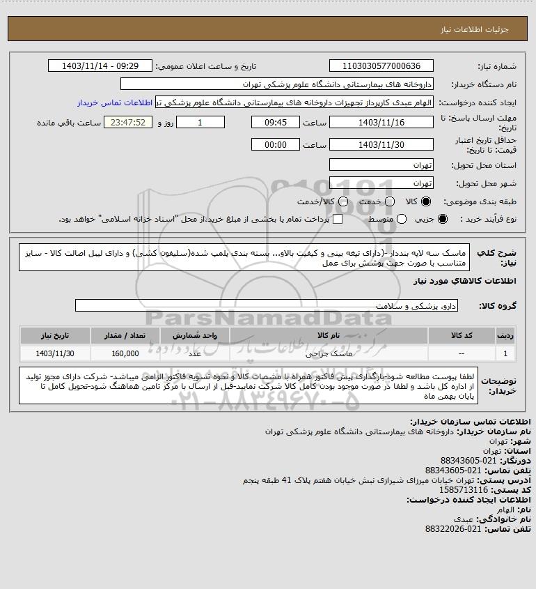 | 1 | -- | ماسک جراحی | عدد | 160,000 | 1403/11/30 |