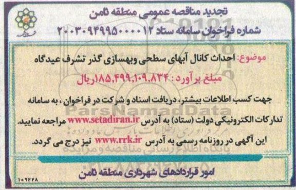 تجدید مناقصه احداث کانال آبهای سطحی و بهسازی گذر تشرف عیدگاه از کلیه افراد متخصص و شرکتها واجد شرایط دعوت به عمل میآید در مناقصه با کد خبرگزاری پارس نماد: 8625721 شرکت نمایند.
