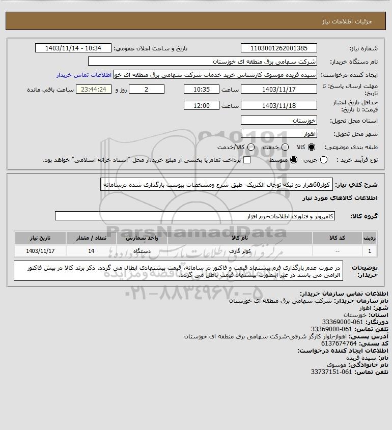 نام دستگاه خریدار:شرکت سهامی برق منطقه ای خوزستان