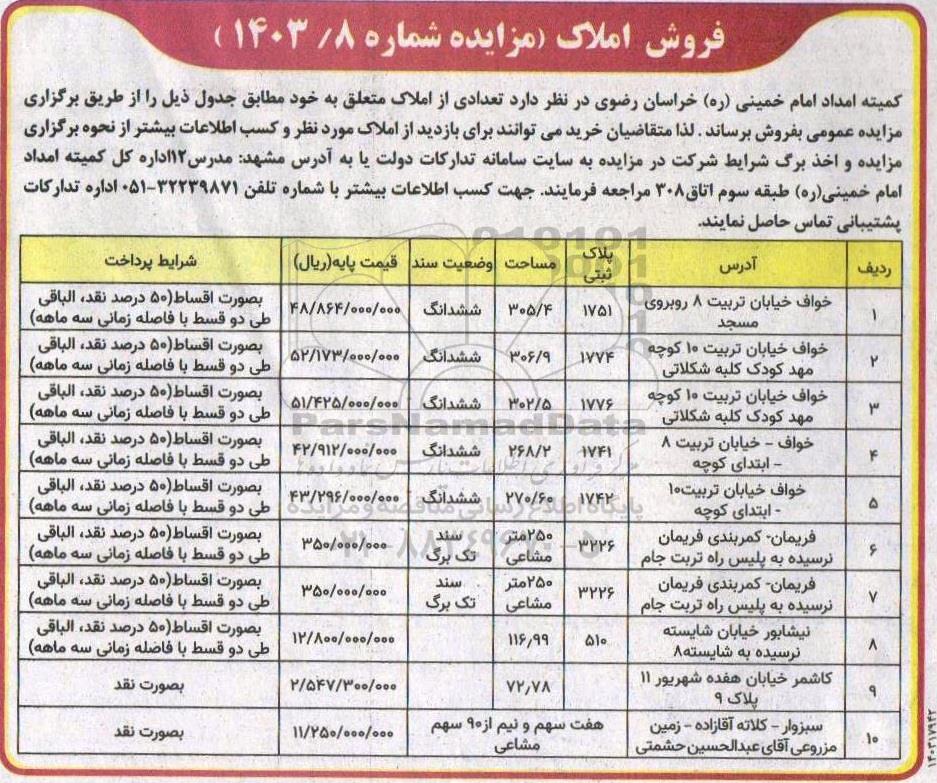 مزایده عمومی مزایده فروش تعدادی از املاک برگزار میگردد. از کلیه افراد متخصص و شرکتهای واجد شرایط دعوت به عمل میآید تا در این مزایده با کد خبرگزاری پارس نماد : 8625836 شرکت نمایند تاریخ شروع مزایده : 1403/11/14 مهلت شرکت در مزایده: تا پایان روز 1403/12/04 مکان برگزاری اموال واگذاری استانهای خراسان رضوی و دستهبندیهای مربوط به این حراجی املاک و زمین میباشد.