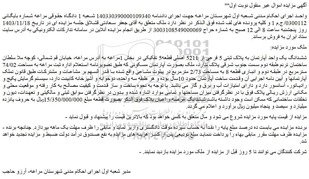 شعبه صادر کننده:شعبه اول اجرای احکام مدنی دادگستری شهرستان مراغه