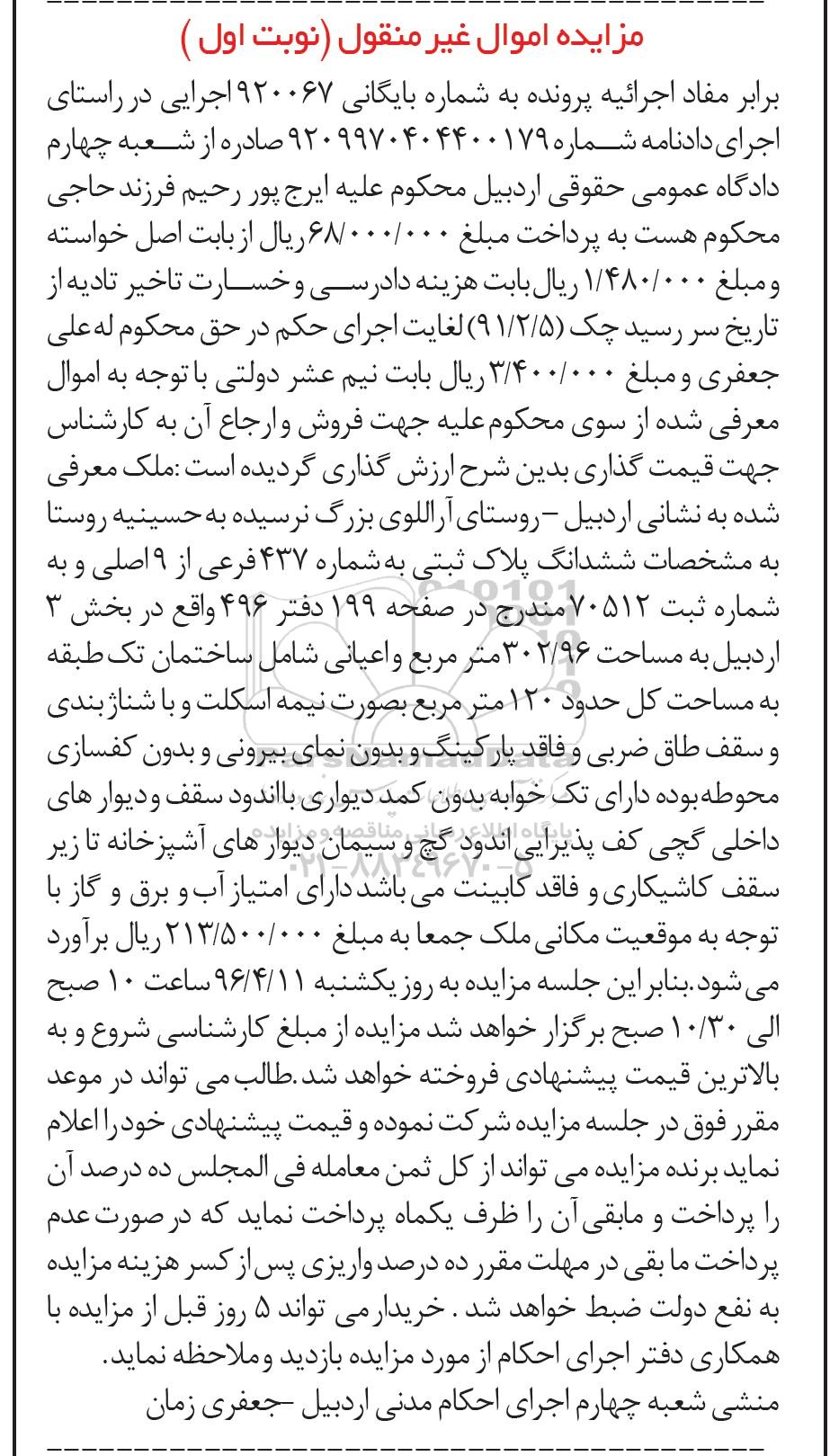 مزایده ملک به مساحت 302.96مترمربع نوبت اول به شماره بایگانی 920067