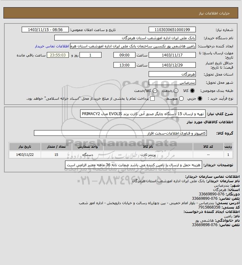 شرح کلی نیاز: تهیه و ارسال 15 دستگاه چاپگر صدور آنی کارت برند EVOLIS مدل PRIMACY2