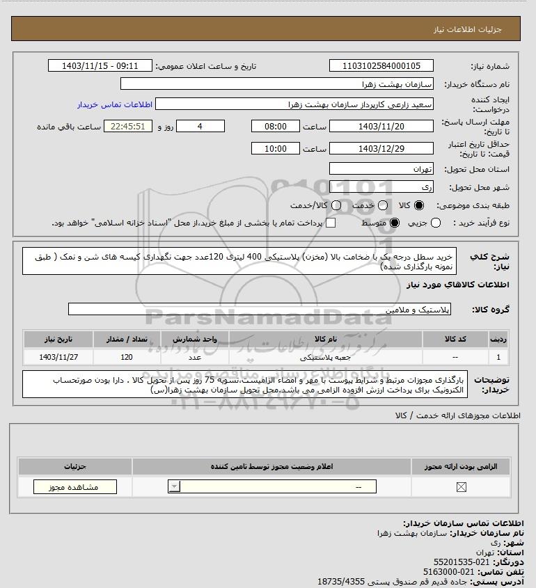 شرح کلی نیاز: خرید سطل درجه یک با ضخامت بالا (مخزن) پلاستیکی 400 لیتری 120عدد جهت نگهداری کیسه های شن و نمک ( طبق نمونه بارگذاری شده)