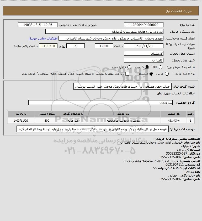 شرح کلی نیاز: حداث چمن مصنوعی در روستای طای بخش موچش طبق لیست پیوستی