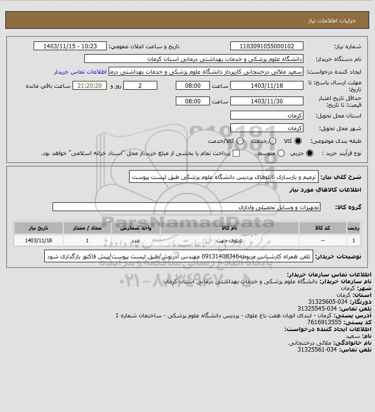 شرح کلی نیاز: ترمیم و بازسازی تابلوهای پردیس دانشگاه علوم پزشکی طبق لیست پیوست