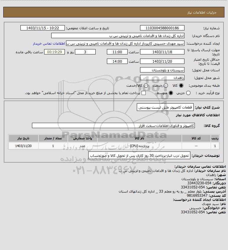 شرح کلی نیاز: قطعات کامپیوتر طبق لیست پیوستی