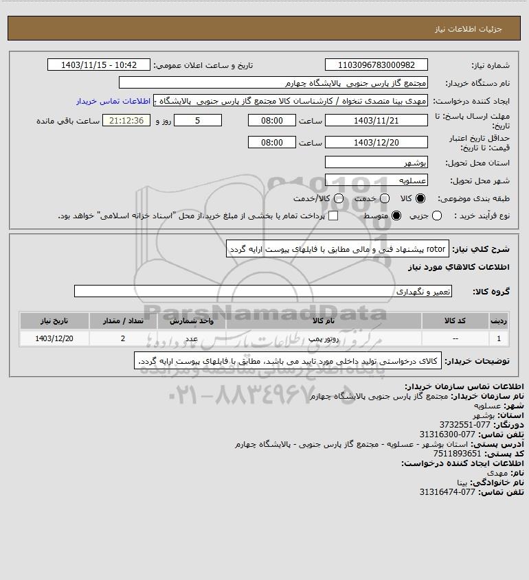 | 1 | -- | روتور پمپ | عدد | 2 | 1403/12/20 |