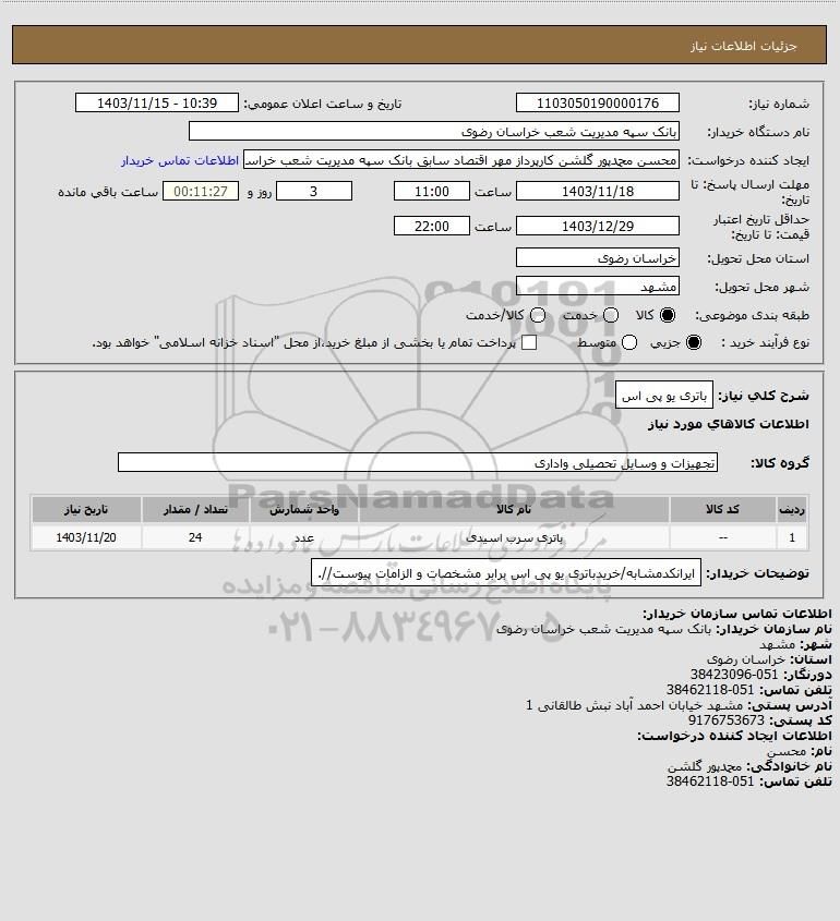 توضیحات خریدار:ایرانکدمشابه/خریدباتری یو پی اس برابر مشخصات و الزامات پیوست//.