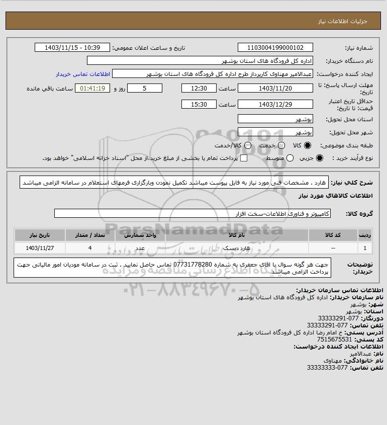 استعلام بها و موضوع استعلام استعلام هارد . مشخصات فنی مورد نیاز به فایل پیوست میباشد تکمیل نمودن وبارگزاری فرمهای استعلام در سامانه الزامی میباشد به اطلاع کلیه شرکت‌ها و افراد متخصص واجد شرایط می‌رساند، آگهی گذار در نظر دارد از طریق استعلام بها، نسبت به انتخاب و دریافت پیشنهادات اقدام نماید. این استعلام با کد آگهی ثبت شده در سامانه خبرگزاری پارس نماد : 8631290 منتشر شده است. مشخصات استعلام : تاریخ شروع استعلام: 1403/11/15 آخرین مهلت ارسال پیشنهاد قیمت : 1403/11/20 و محل اجرای پروژه : استان بوشهر میباشد. استعلام قیمت مورد درخواست : استعلام هارد . مشخصات فنی مورد نیاز به فایل پیوست میباشد تکمیل نمودن وبارگزاری فرمهای استعلام در سامانه الزامی میباشد با دسته‌بندی‌های تخصصی و گروه های مرتبط : کامپیوتر, استعلام اطلاع رسانی میگردد.