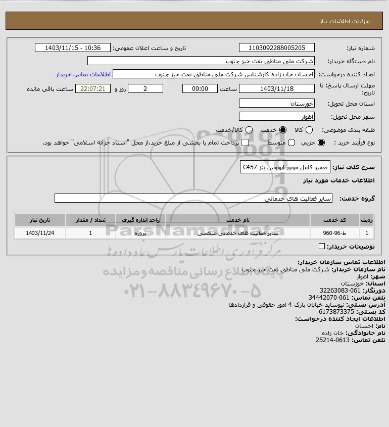 شرح کلی نیاز: تعمیر کامل موتور اتوبوس بنز C457