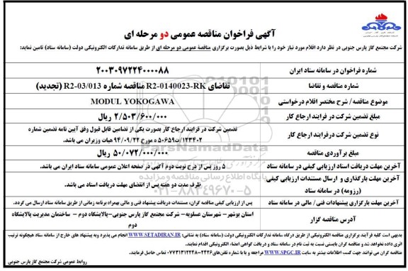 تجدید فراخوان مناقصه MODUL YOKOGAWA, تجدید فراخوان مناقصه MODUL YOKOGAWA