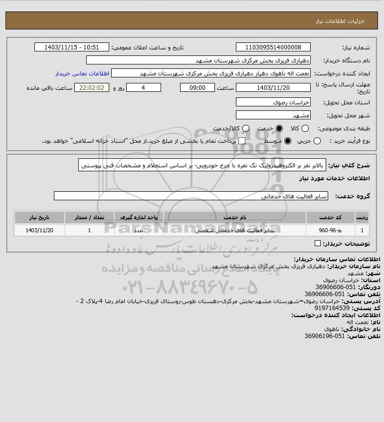 شرح کلی نیاز: بالابر نفر بر الکتروهیدرولیک تک نفره با چرخ خودرویی- بر اساس استعلام و مشخصات فنی پیوستی