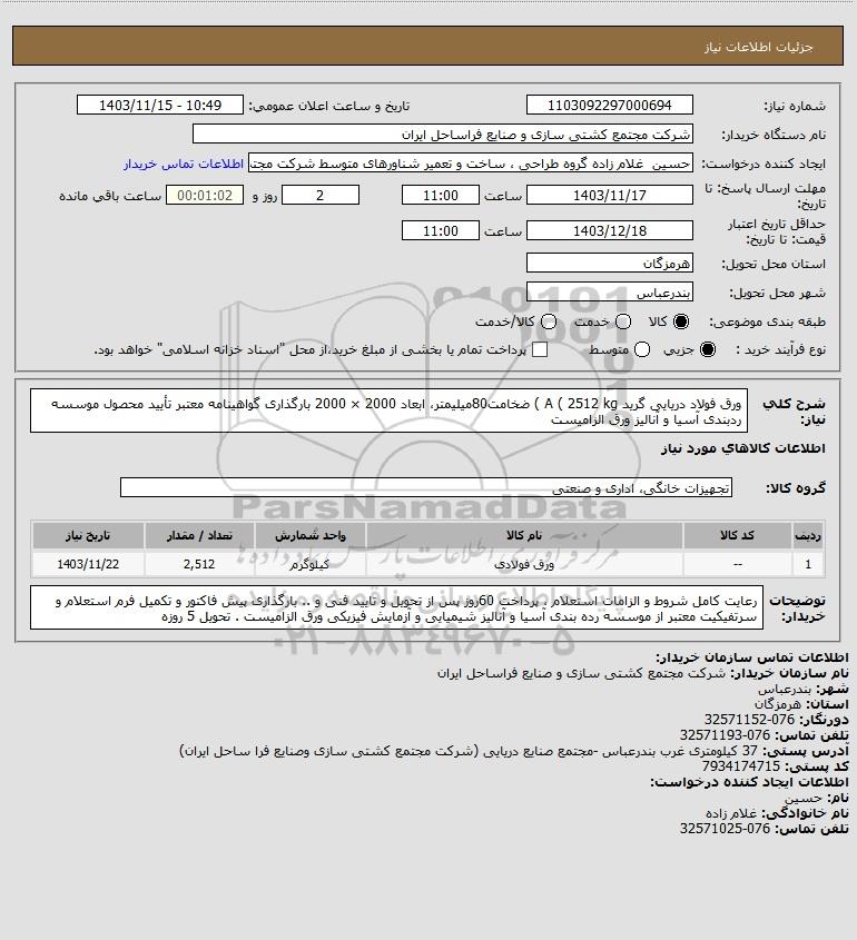 شرح کلی نیاز: ورق فولاد دریایی گرید A ( 2512 kg ) ضخامت80میلیمتر، ابعاد 2000 × 2000 بارگذاری گواهینامه معتبر تأیید محصول موسسه ردبندی آسیا و آنالیز ورق الزامیست