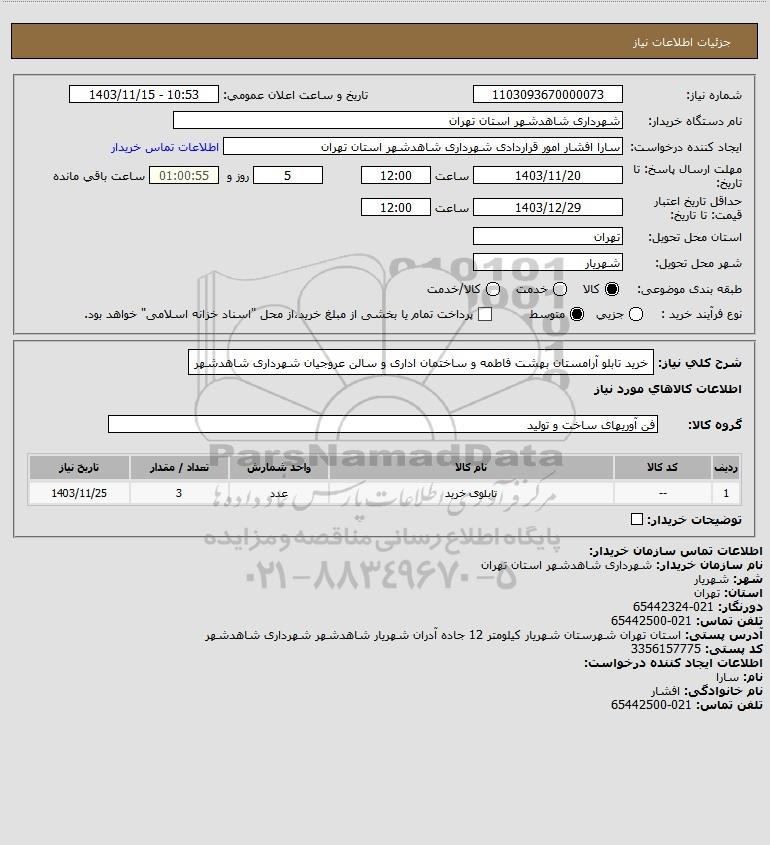 شرح کلی نیاز: خرید تابلو آرامستان بهشت فاطمه و ساختمان اداری و سالن عروجیان شهرداری شاهدشهر