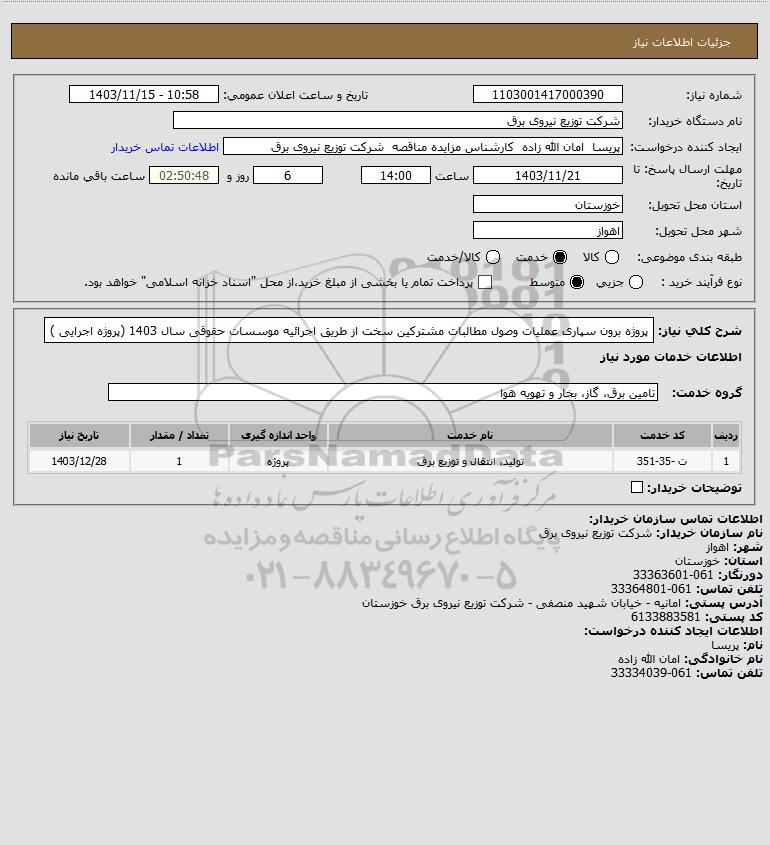شرح کلی نیاز: پروژه برون سپاری عملیات وصول مطالبات مشترکین سخت از طریق اجرائیه موسسات حقوقی سال 1403