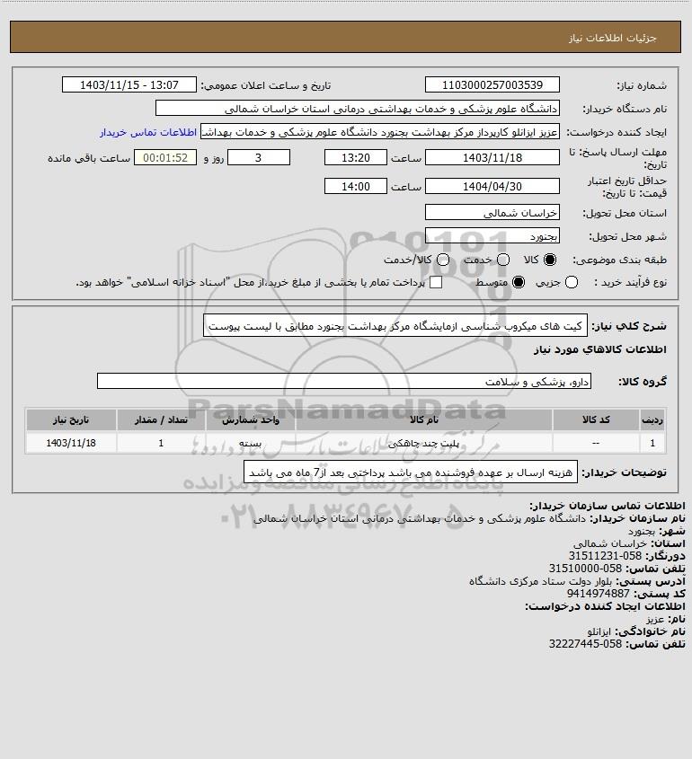 شرح کلی نیاز: کیت های میکروب شناسی ازمایشگاه مرکز بهداشت بجنورد مطابق با لیست پیوست