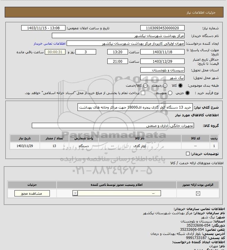 شرح کلی نیاز: خرید 13 دستگاه کولر گازی پنجره ای18000 جهت مراکز وخانه های بهداشت