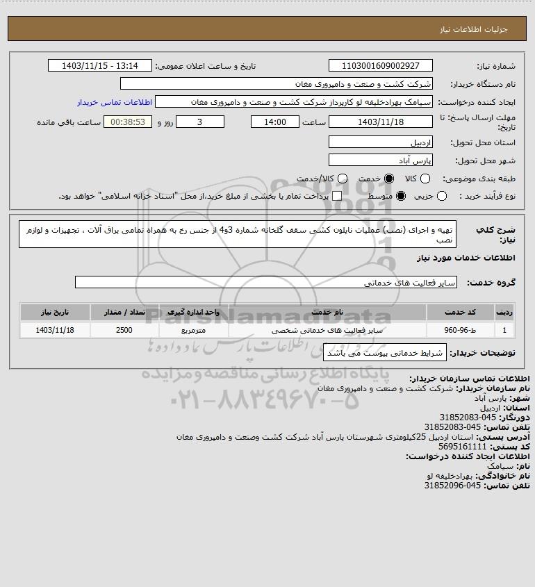 شرح کلی نیاز: تهیه و اجرای (نصب) عملیات نایلون کشی سقف گلخانه شماره 3و4 از جنس رخ به همراه تمامی یراق آلات ، تجهیزات و لوازم نصب