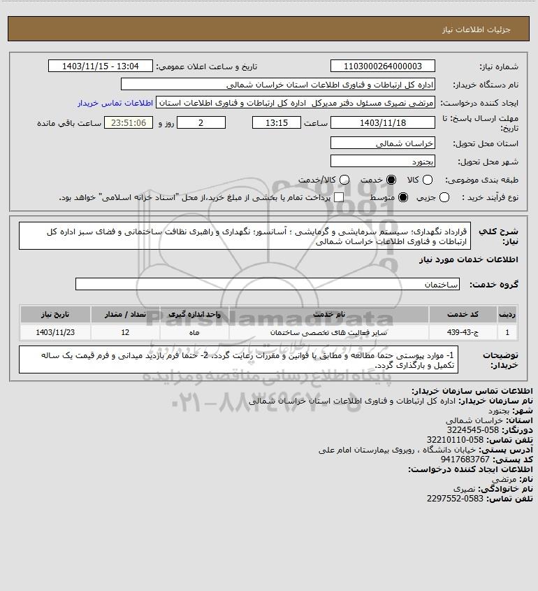 شرح کلی نیاز: قرارداد نگهداری؛ سیستم سرمایشی و گرمایشی ؛ آسانسور؛ نگهداری و راهبری نظافت ساختمانی و فضای سبز اداره کل ارتباطات و فناوری اطلاعات خراسان شمالی