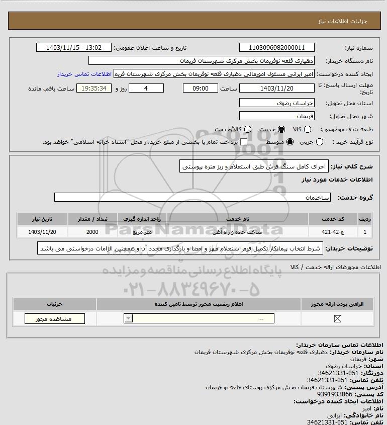 شرح کلی نیاز: اجرای کامل سنگ فرش طبق استعلام و ریز متره پیوستی